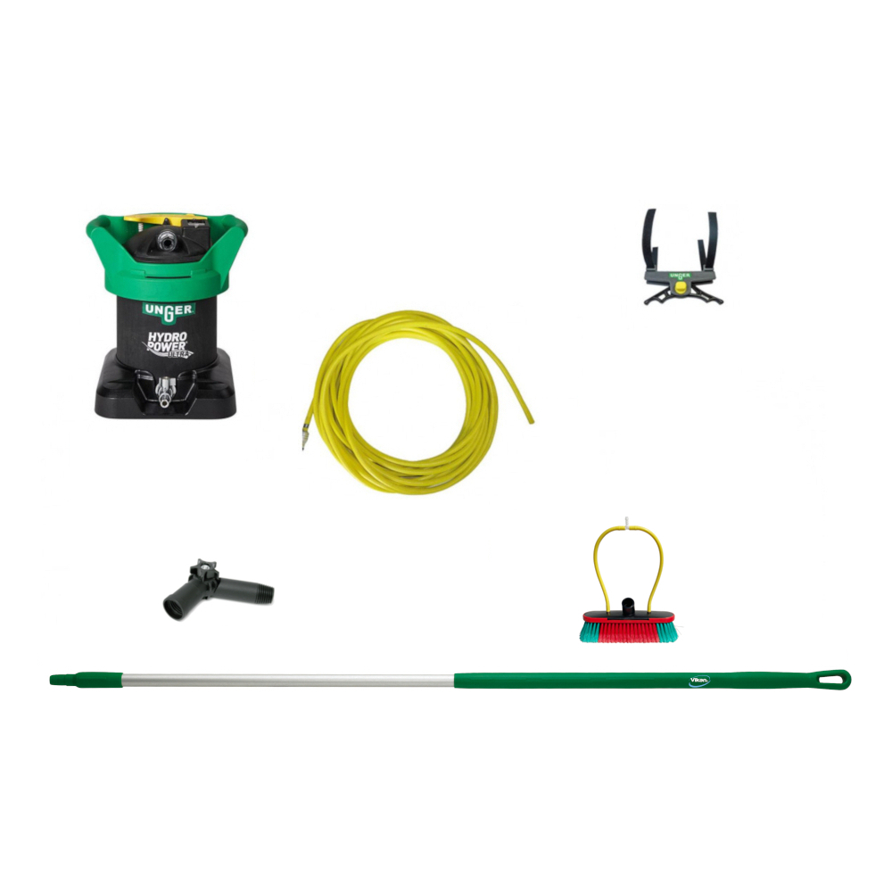 Danmarks laveste pris på et rentvandsanlæg, komplet og klar til brug. Leveres med en kort og let aluminiumsstang på kun 151 cm. Sættet er derfor skræddersyet til vask af vinduer i 1-plans huse.
