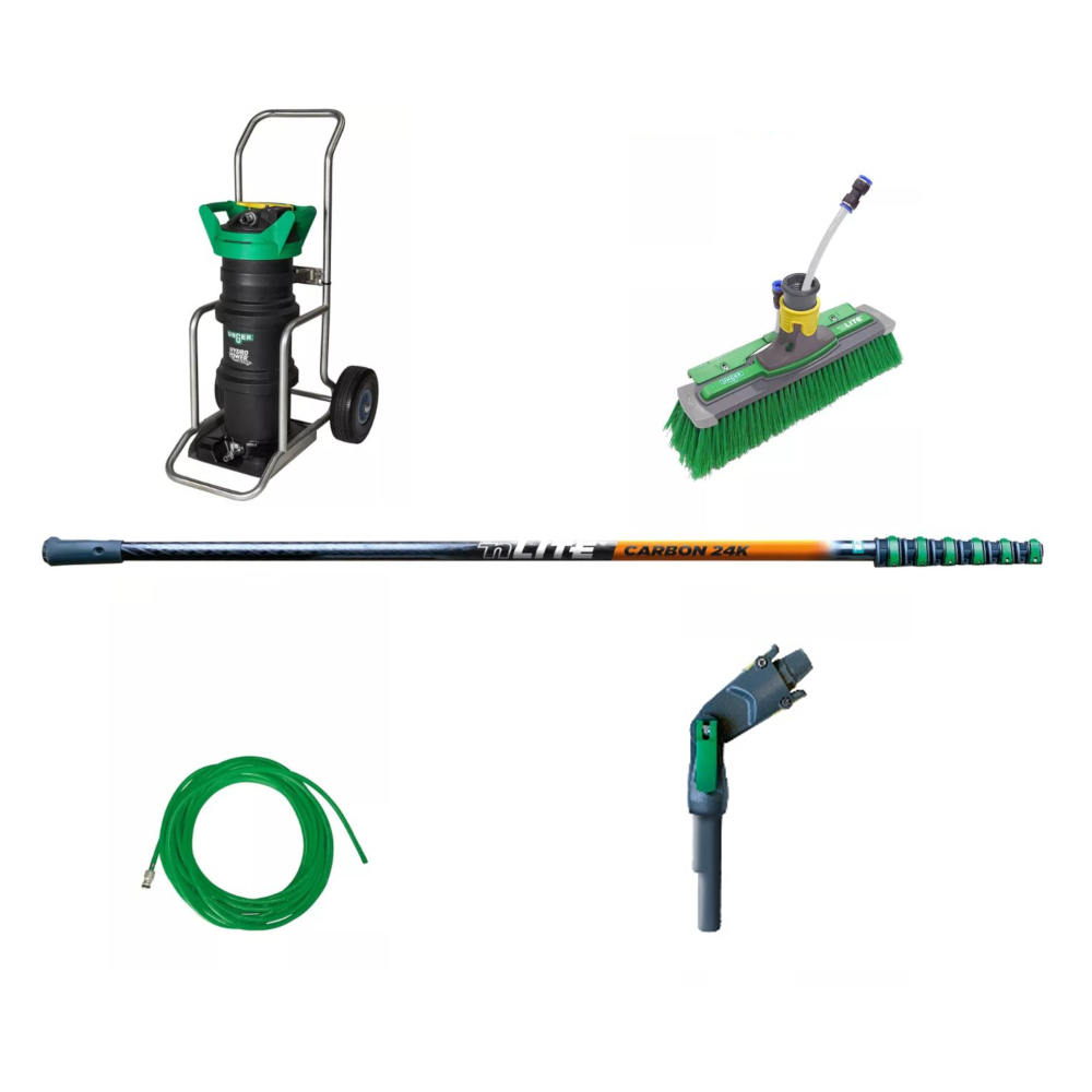 Komplet rentvandsanlæg på kørevogn - og med 8,6 meter vandførende teleskopstang af kulfiber. Perfekt til vask af fx vinduer, solceller og glaspartier. Dette store rentvandsanlæg anbefales til miljøer med meget glas og hvor der er behov for at køre rundt på forskellig underlag.