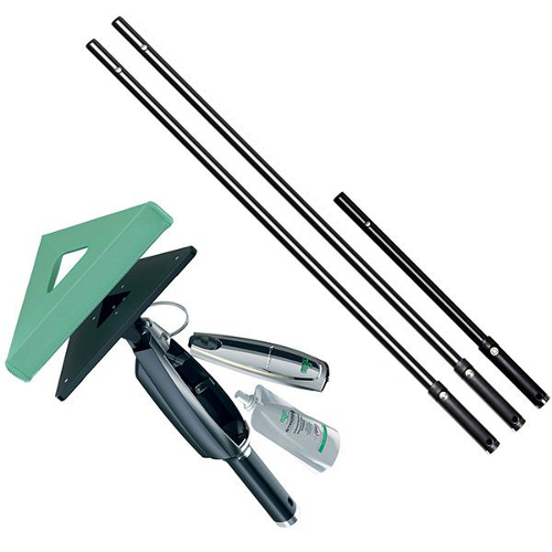 Kan anvendes uden eller med˜forlængerrør og kan helt˜samlet blive op til 3,3 meter. Sættet består også at et håndtag med integreret tank til pudsemiddel, en batteridrevet spraypumpe, hvorfra der pumpes pudsemiddel˜ud i selve vaskemoppen.