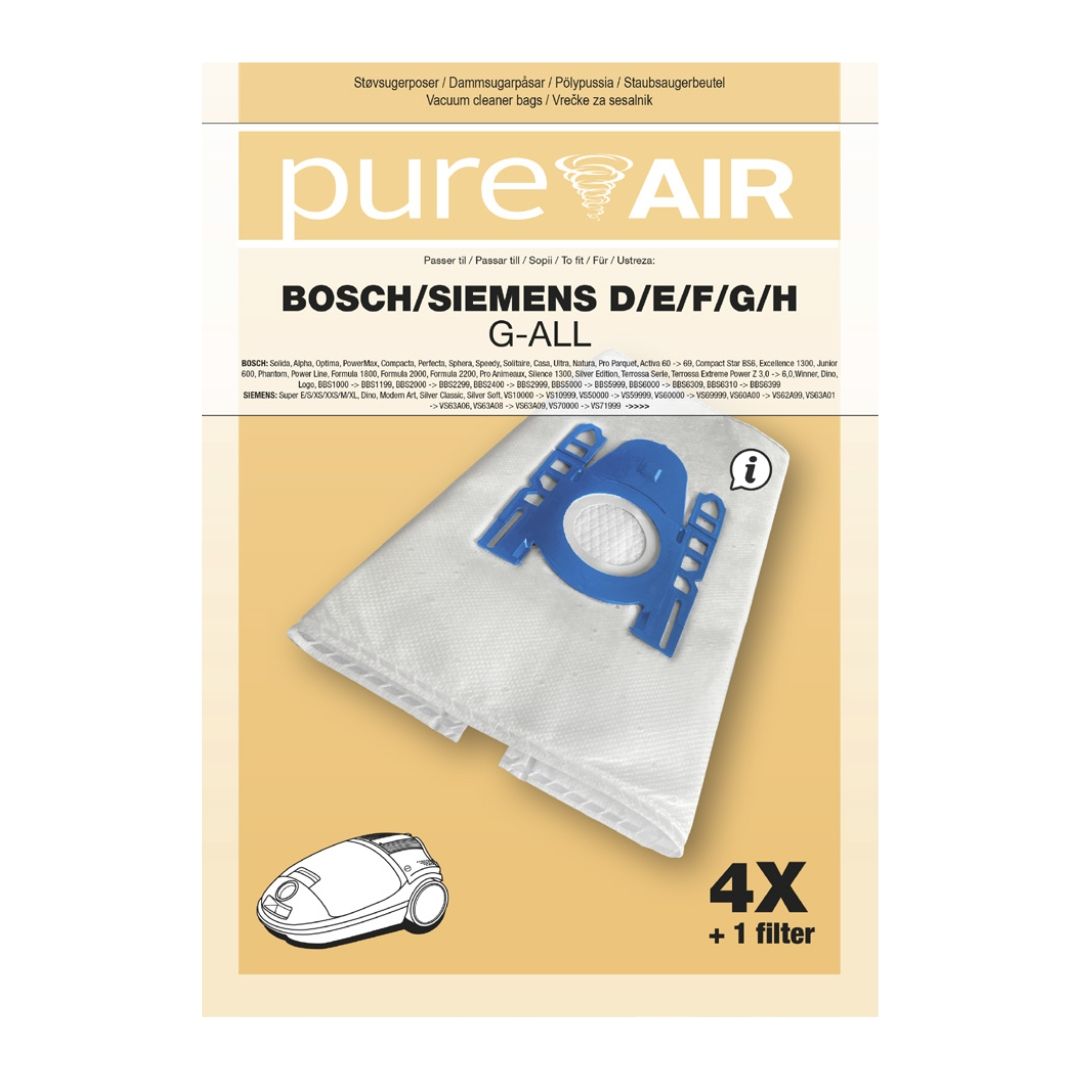 Bosch og Siemens støvsugeposer fra Pure Air giver dig effektiv rengøring, stærk sugeevne og længere levetid på din støvsuger. I pakken får du 4 slidstærke poser samt 1 filter, som både sikrer renere luft i hjemmet og beskytter motoren, så din Bosch eller Siemens støvsuger holder længere.